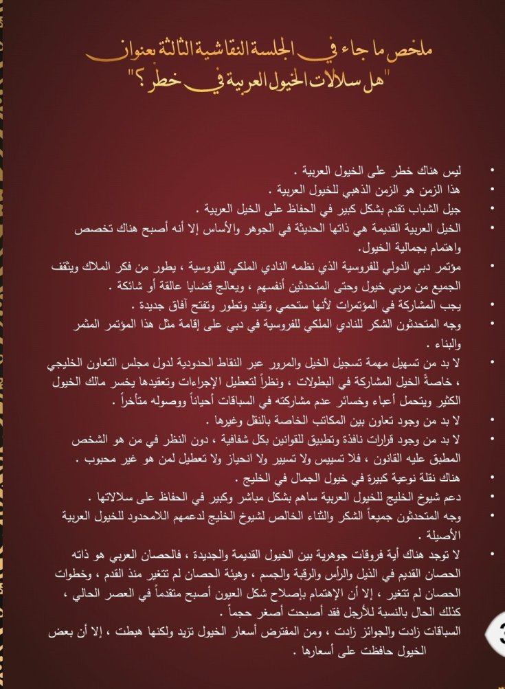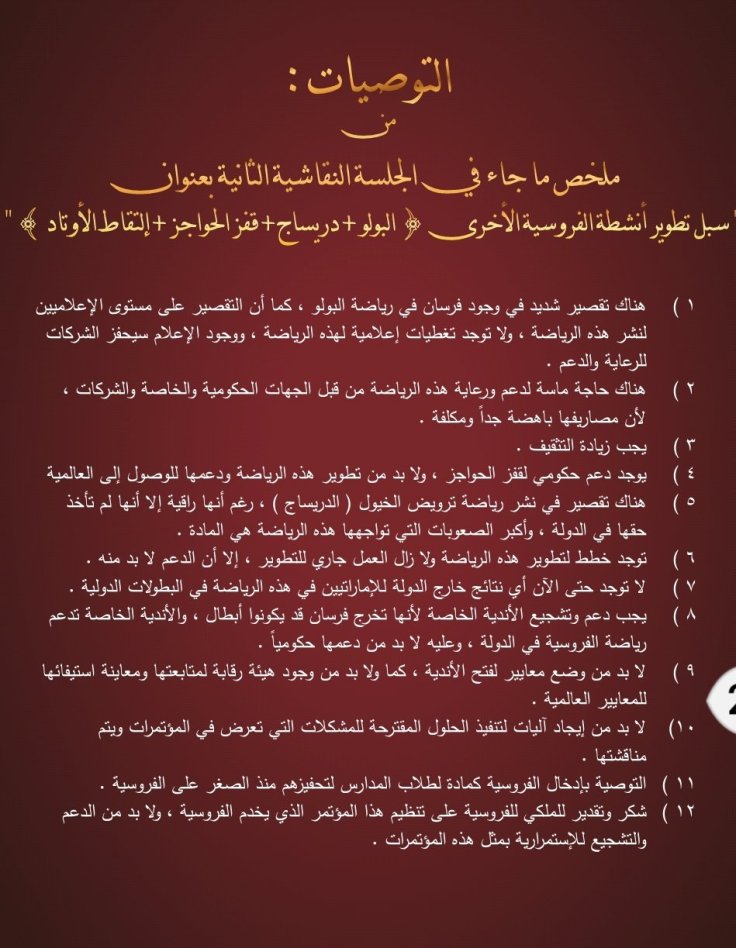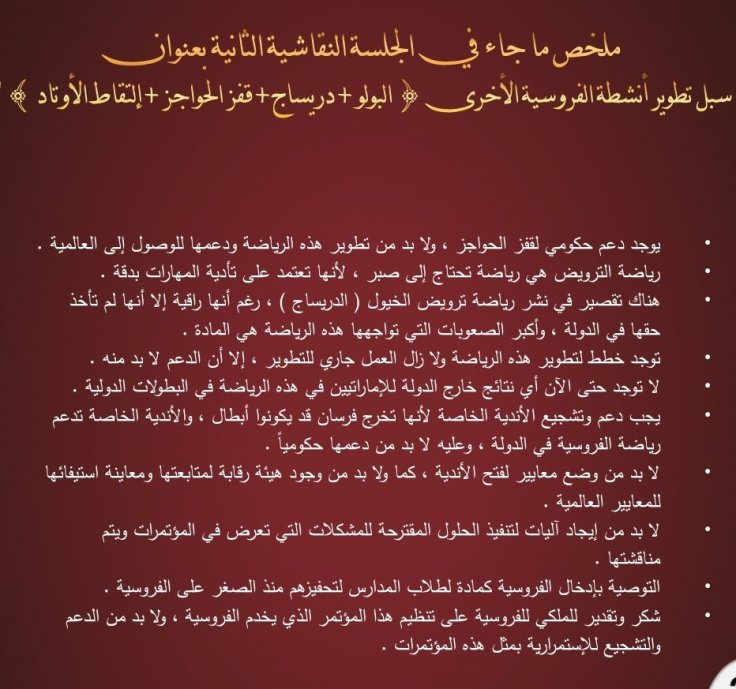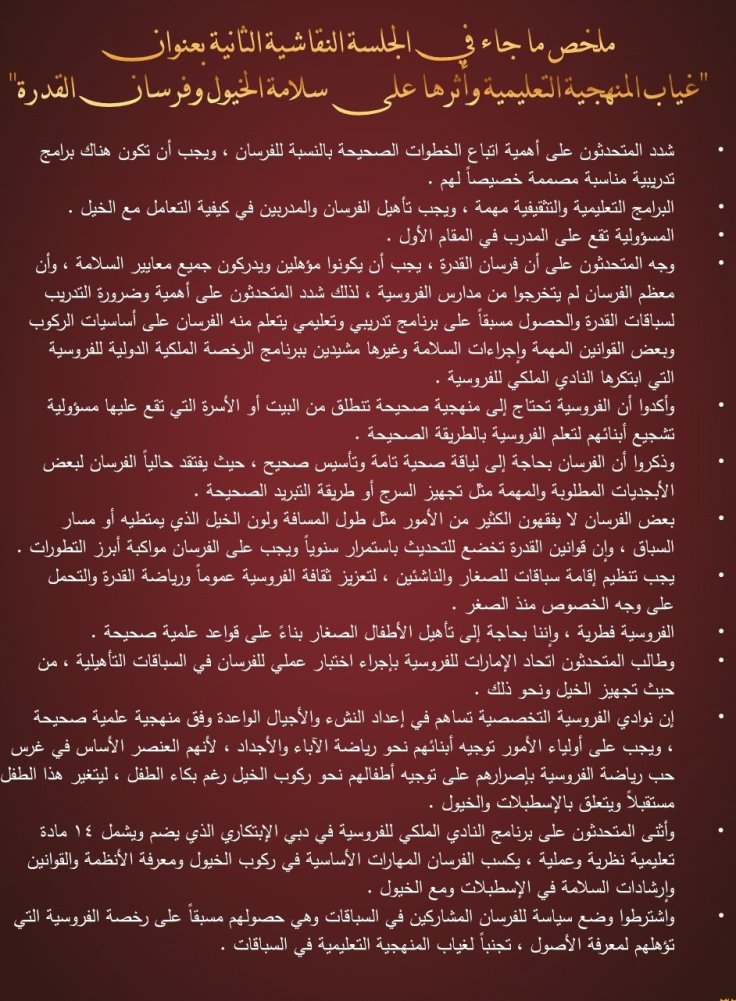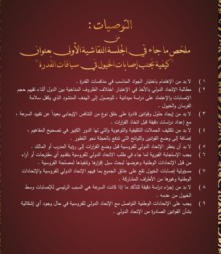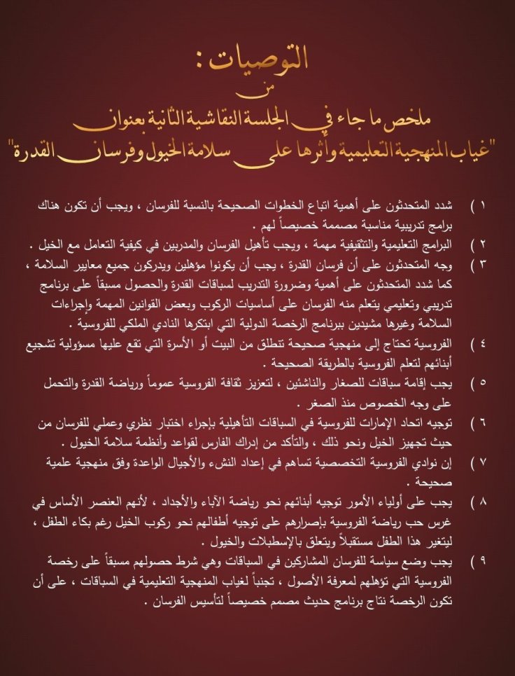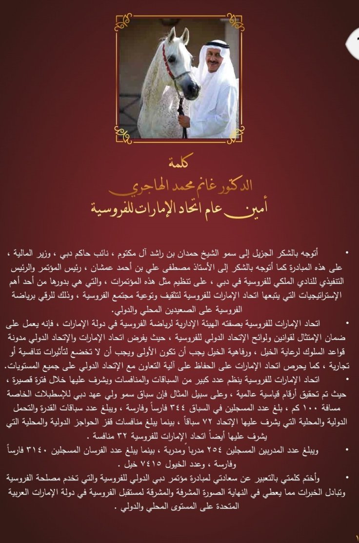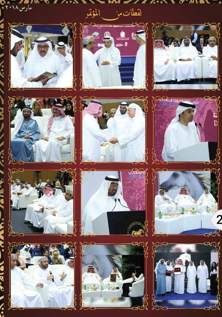 وقد تضمن الكتيب تقريرا كاملا للتوصيات التي صدرت عن فعاليات الدورتين السابقتين عبر كلمات المتحدثين من علماء ومختصين وأكاديميين في رياضة الفروسية ومسؤولي الأندية الخليجية للفروسية وعبر الجلسات النقاشية التي أثمرت العديد من المقترحات التي تعالج مختلف نواحي تطوير رياضة الأجداد وترجمة لشعار المؤتمر ” دبي القلب النابض لفروسية العالم ”