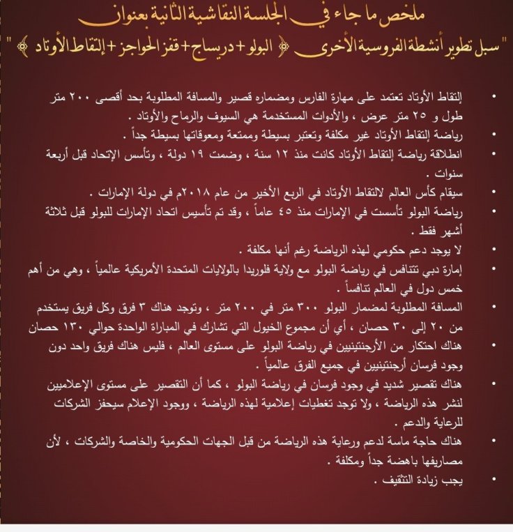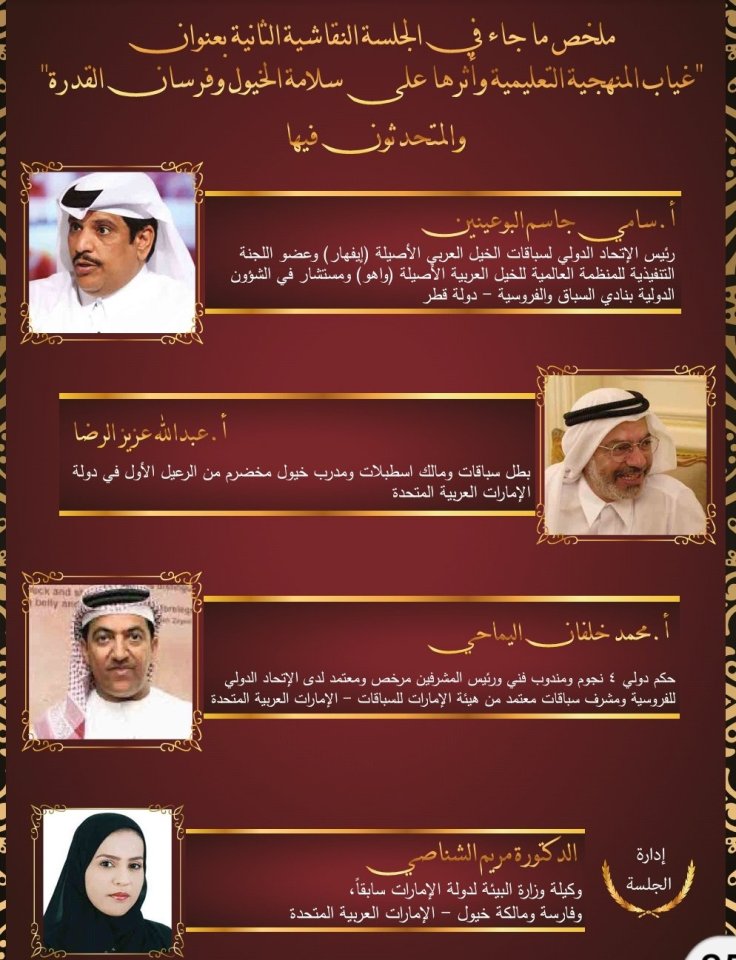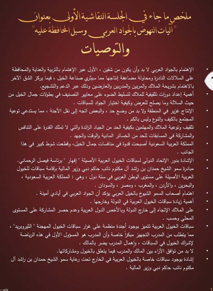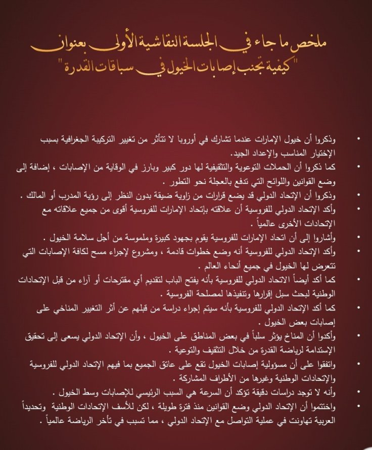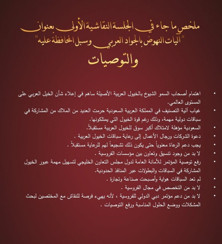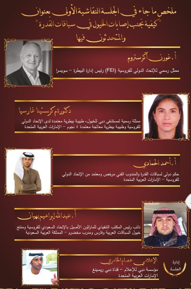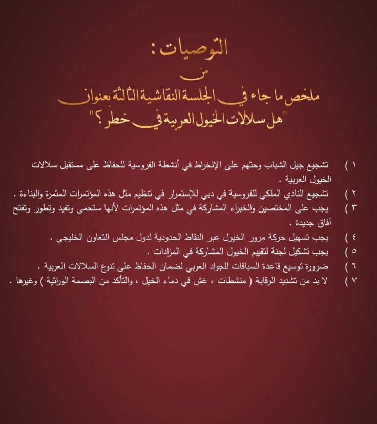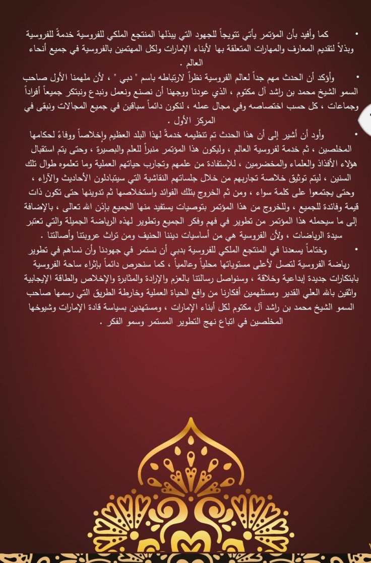 وقد تضمن الكتيب تقريرا كاملا للتوصيات التي صدرت عن فعاليات الدورتين السابقتين عبر كلمات المتحدثين من علماء ومختصين وأكاديميين في رياضة الفروسية ومسؤولي الأندية الخليجية للفروسية وعبر الجلسات النقاشية التي أثمرت العديد من المقترحات التي تعالج مختلف نواحي تطوير رياضة الأجداد وترجمة لشعار المؤتمر ” دبي القلب النابض لفروسية العالم ”