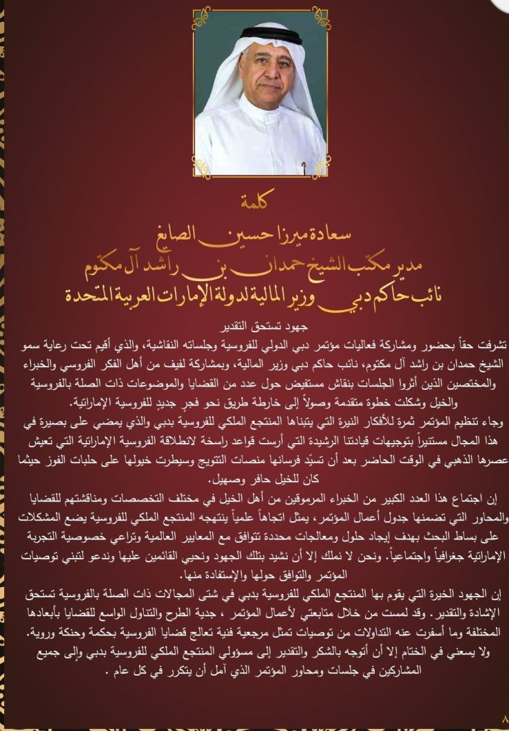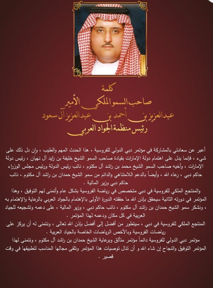 وبهذه المناسبة يسعد اسرة التحرير في مجلة ديانا سكووب ومؤسسة النابلسي انترناشيونال DMCC ان تهنئ الملكي للفروسية والقائمين عليه وفي مقدمتهم سعادة الأستاذ مصطفى عمشان رئيس مؤتمر دبي للفروسية وسعادة الأستاذ سيف بن مزينة رئيس مجلس ادارة الملكي للفروسية على هذا النجاح الباهر في تنظيم وادارة واستضافة هذا الحدث الدولي المهم متمنين لهم كل التوفيق والازدهار في الدورات القادمة وفي سعيهم الحثيث للمساهمة الميدانية الجادة والعلمية في تطوير رياضة الأجداد .