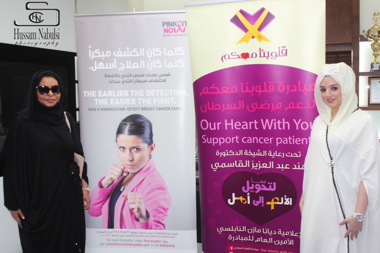برعاية وحضور الشيخة الدكتورة هند بنت عبد العزيز القاسمي رئيسة نادي الإمارات الدولي للأعمال وبمناسبة شهر اكتوبر الوردي نظمت مبادرة قلوبنا معكم متمثلة بالاعلامية ديانا النابلسي المؤسس والأمين العام للمبادرة والمدير التنفيذي لشركة النابلسي إنترناشيونال لتنظيم المبادرات المجتمعية بزيارة الى مشفى زليخة في منطقة القصيص بإمارة دبي