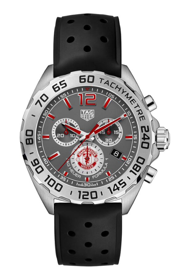 يمتاز هذا الطراز المصنوع من الفولاذ بالكامل والمستوحى من عالم كرة القدم بكرونوغراف كوارتز مع إطار فولاذي ذي تجويف يشتمل على مقياس تاكيمتر. ويخطف شعار نادي مانشستر يونايتد، الذي يزين العداد عند موضع الساعة 6، الأنظار بفضل لونه الأحمر الجذاب. ويستقر عرض التاريخ عند موضع الساعة 4 على قرصٍ أسود اللون. ويزدان غطاء الساعة الخلفي المثبت ببراغي بنقش محفور لشعار نادي مانشستر يونايتد. ويتوفر هذا الطراز بسوار مطاطي مثقوب يكتسي باللون الأسود ليتألق بمظهر عصري غير مسبوق. ولا يعد هذا الكرونوغراف مجرد تحفة بصرية تزينها التشطيبات المتقنة المستوحاة من ألوان أحد أشهر أندية العالم مانشستر يونايتد، بل يعتبر أيضا من أرفع الساعات قيمة في الأسواق بفضل عقرب 1/10 ثانية، الذي يكمل دورة واحدة من العداد عند موضع الساعة 6 كل ثانية