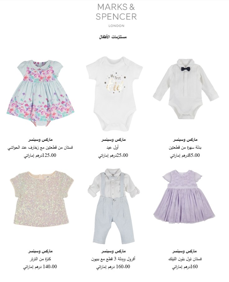 وتضمّ التشكيلة أيضاً تصميم”أول عيد”، وهو رداء من قطعة واحدة مخصص للأطفال حتى عمر السنة. ويعد هذا الخيار أساسياً لحديثي الولادة، أو حتى بالنسبة للمواليد الذين يحتفلون بأول عيد لهم في منطقة الشرق الأوسط. كما يطرح المتجر أفرول وبدلة من 3 قطع مع ببيون ليمنح الفتيان إطلالةً ساحرةً، بينما يمكن للأميرات الصغيرات التألق بكنزات من الترتر وفساتين مزينة بالزخارف.