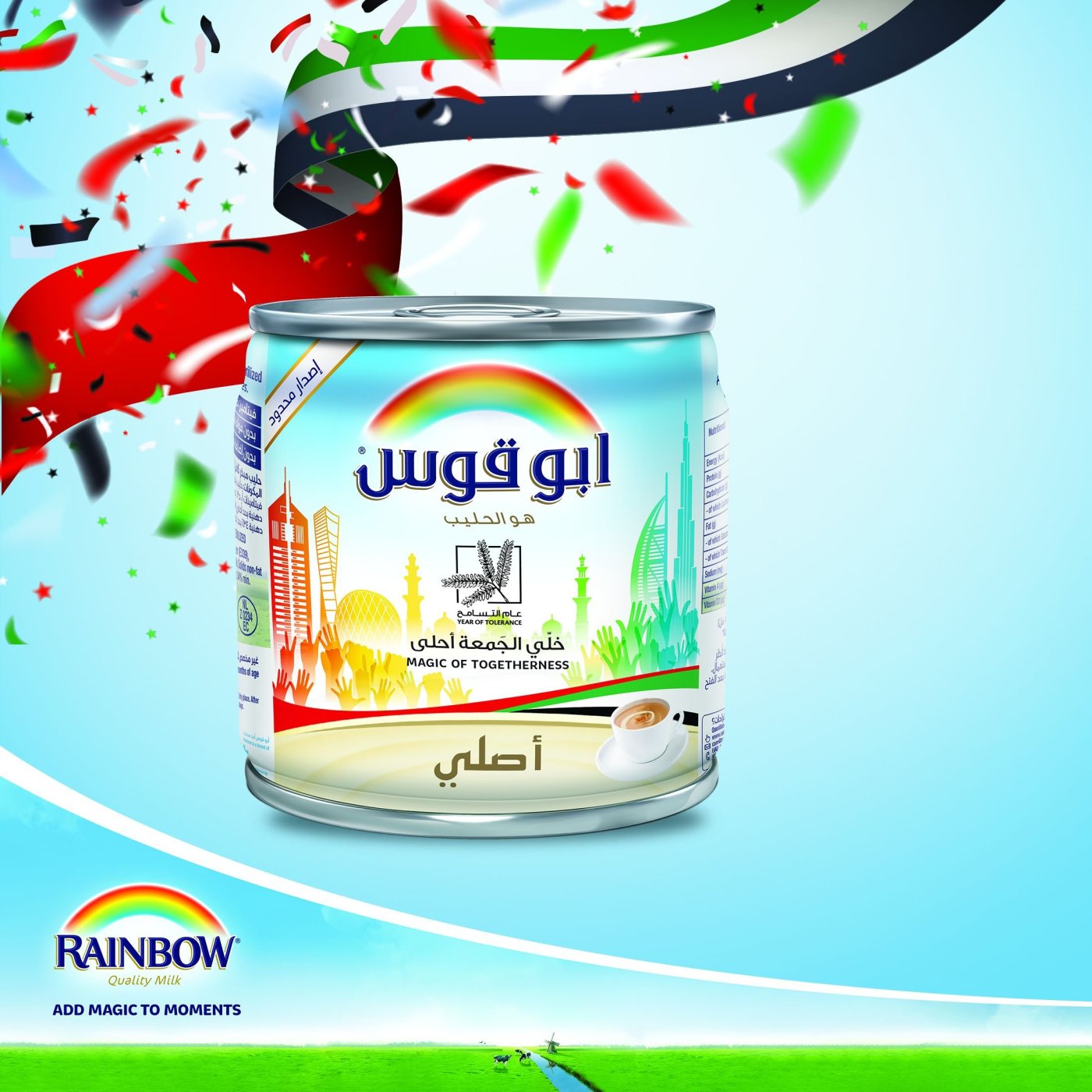وتكريماً لارتباط العلامة العميق بثقافة البلاد، تحمل العبوة الجديدة شعار “عام التسامح” الذي تبنته دولة الإمارات العربية المتحدة. ولطالما كان حليب “أبو قوس” عنصراً أساسياً على رفوف محلات الشاي والمقاهي والمطاعم، حيث بقي ولعقود طويلة الحليب المفضل لإعداد شاي “الكرك” وغيره من المشروبات الساخنة في مختلف أرجاء دولة الإمارات؛ حتى أن “متحف دبي” يعرض نسخة قديمة من عبوة حليب “أبو قوس”.