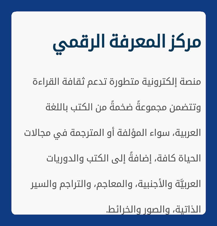 وأفاد «كما توفِّر منصة المركز كافَّةِ مطبوعاتِ المؤسَّسة التي تقدِّمها لخدمةِ المعرفةِ والإسهامِ في سدِّ الفجوةِ الرقميَّةِ العربية. حيث تُعَدُّ أوَّلُ أداةٍ برمجيَّةٍ عربيَّةٍ متكاملةٍ تُسْهِمُ في تطويرِ سوقِ البرمجيَّاتِ والأنظمةِ الرقميَّةِ العربيَّةِ، وتمكِّنُ المؤسَّساتِ مِن بناءِ مستودعاتِها وحفظِ ذاكرتِها الرقميَّةِ بتطبيقِ المعاييرِ الدوليَّةِ لدعمِ مستقبلِ المعرفةِ والتعليمِ في العالَم». وأشار إلى أنَّ منصة المركز تعزِّز القراءة الإلكترونية من خلال واجهة تعامل سهلة وبسيطة وتتضمَّن كذلك 15 مكتبة نوعية في مجالات متخصِّصة منها: الفضاء والتاريخ والذكاء الاصطناعي.