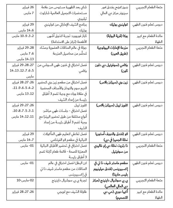 وتوجد أكثر من 80 فرصة للمشاركة في أحد دروس تعلم الطهي أو الجلوس على “مائدة الطعام مع كبير الطهاة”، وغيرها الكثير من تجارب الطعام الممتعة – ولكن هذه الفعاليات تقام لمرة واحدة فقط، ولن تكون فرصة المشاركة إلا لقلة قليلة مختارة بعناية.