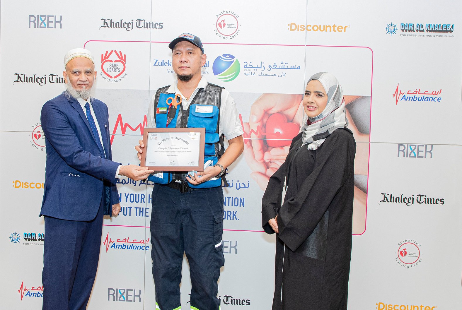 وبهذه المناسبة ، تم تكريم موظفي الخطوط الأمامية في مؤسسة دبي لخدمات الإسعاف، وجمعية القلب الأمريكية ؛ لالتزامهم كأول مستجيبين داعمين لمبادرة “إنقاذ القلوب”، التي تأتي ضمن برنامج التوعية المستمر بالمستشفى من أجل رفاهية سكان دولة الإمارات العربية المتحدة الذي يقوم بتدريب الأفراد على مهارات الإنعاش القلبي الرئوي، التي يمكن أن تنقذ الحياة أثناء حالات الطوارئ القلبية. وبدعم من المدربين المعتمدين في مؤسسة دبي لخدمات الإسعاف، تم استضافة الفريق الخاص بجمعية القلب الأمريكية ، وتنفيذ دورات تدريبية حول الإنعاش القلبي الرئوي عبر العديد من المساجد والمكاتب الحكومية والمدارس والكليات والنوادي الرياضية والعديد من التجمعات العامة والشركات الأخرى بهدف تعليم كل فرد منقذ للحياة مهارة الإنعاش القلبي الرئوي. ويتم دعم أنشطة التوعية هذا العام أيضًا من قبل: مؤسسة دبي لخدمات الإسعاف وجمعية القلب الأمريكية والخليج تايمز ودار الخليج وتطبيق العروض وتطبيق رِزْق.