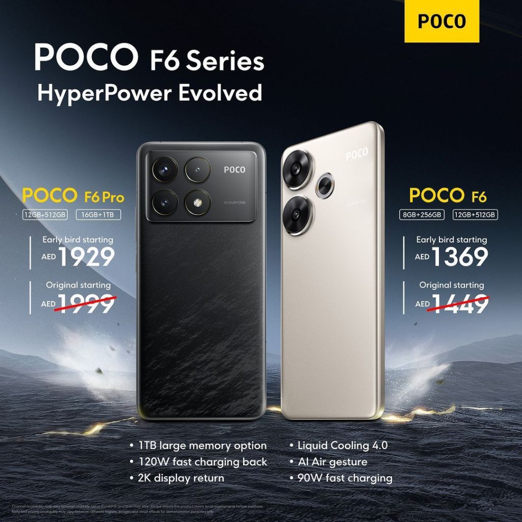 تنطلق المبيعات الرسمية ابتدائاً من 25 مايو في أسواق الإمارات العربية المتحدة، حيث يتوفر POCO F6 Pro بألوان كلاسيكية من الأسود والأبيض، مع سعة تتراوح من 12 جيجابايت + 256 جيجابايت إلى 16 جيجابايت + 1 تيرابايت. تبدأ أسعار الحجز المبكر من 1929 درهم إماراتي و2299 درهم إماراتي تباعاً. أما POCO F6، فيتوفر باللون الأسود والأخضر والتيتانيوم، مع متغيرات 8 جيجابايت + 256 جيجابايت و12 جيجابايت + 512 جيجابايت. تبدأ أسعار الحجز المبكر من 1369 درهم إماراتي و1479 درهم إماراتي تباعاً. بالإضافة إلى ذلك، يأتي جهاز POCO Pad باللون الرمادي والأزرق، ويتميز بنسخة واحدة بسعة 8 جيجابايت + 256 جيجابايت بسعر 1009 درهم إماراتي.